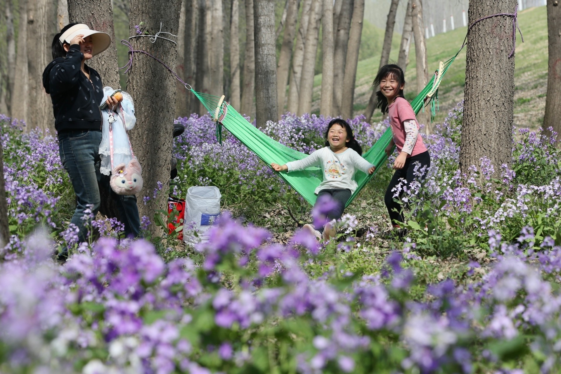 郑州市黄河大堤宋庄段,市民在二月兰花海中休闲放松。王铮 摄